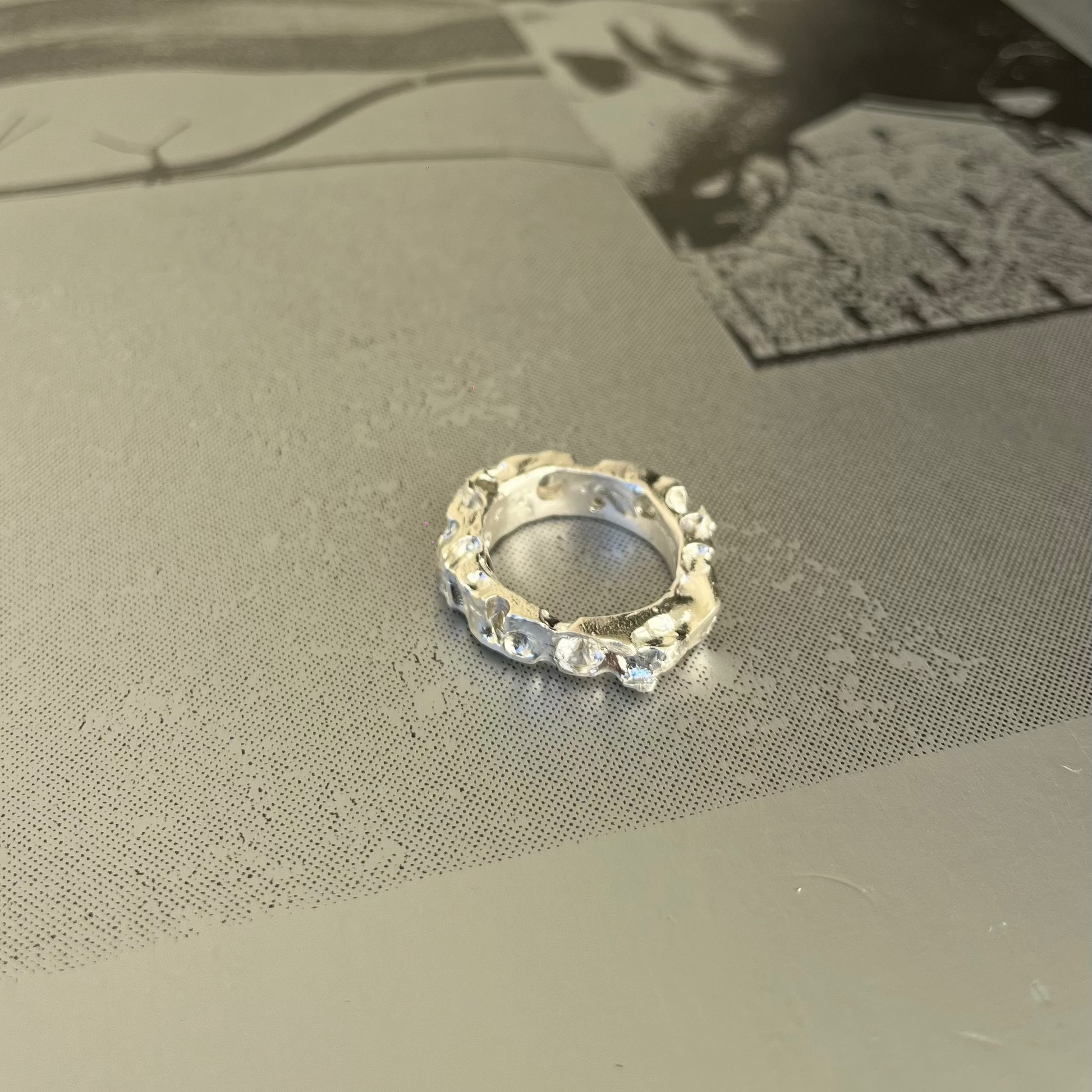 The only ring in our collection adorned with stones — crafted in sleek silver and set with seven deep sapphires. Understated yet luminous, it captures quiet sophistication with every glance